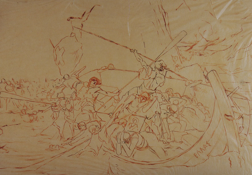 Την πρώτη ενορατική σύνθεση του θέματος (0,38 Χ 0,55 μ.) ο Γύζης την καταγράφει επάνω σε χαρτί με κόκκινο μολύβι. Κατά την άποψή μου, πρέπει να έχουν μεσολαβήσει και άλλα προσχέδια πριν από το τελικό που γνωρίζουμε. Το σχέδιο εδώ είναι περισσότερο σφικτό, ρεαλιστικό, και λιγότερο αυθόρμητο και ελεύθερο, όπου ιδέες τρέχουν και ο καλλιτέχνης αγωνίζεται να τις συλλάβει και να τις καταγράψει με το μολύβι, κάτι που παρατηρείται σε άλλα του έργα, όπως στην «Δόξα των Ψαρών», το «Ιδού ο Νυμφίος έρχεται», «Ο θρίαμβος της Βαυαρίας», «Η Εαρινή συμφωνία» κ.τ.λ. Δίνεται η εντύπωση ότι πρόκειται για μία σύνθεση παράπλευρων μελετών που ανασυντάχθηκαν σε ένα κυρίως θέμα. Η όλη μορφή της εικονογραφίας χαρακτηρίζεται από την παραδοσιακή ιστοριογραφία της Σχολής του Μονάχου.