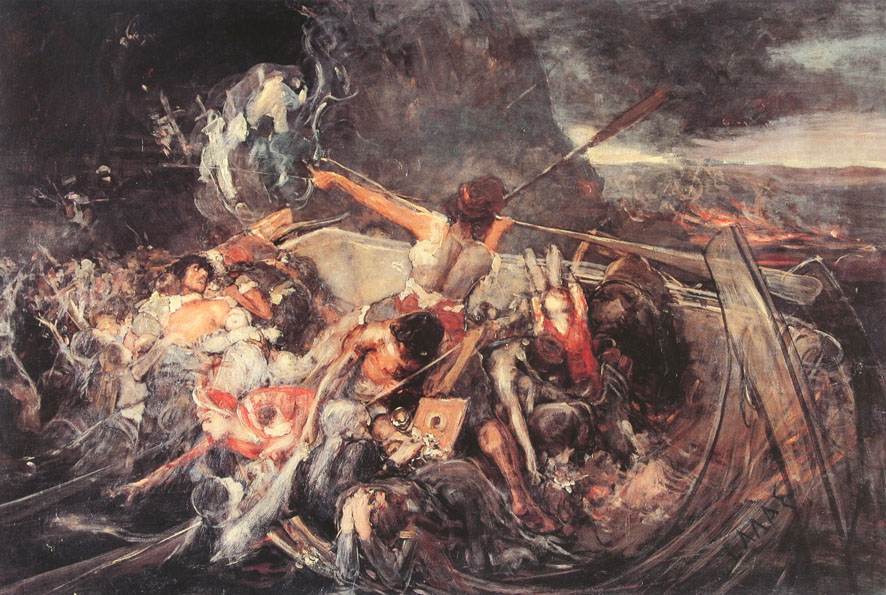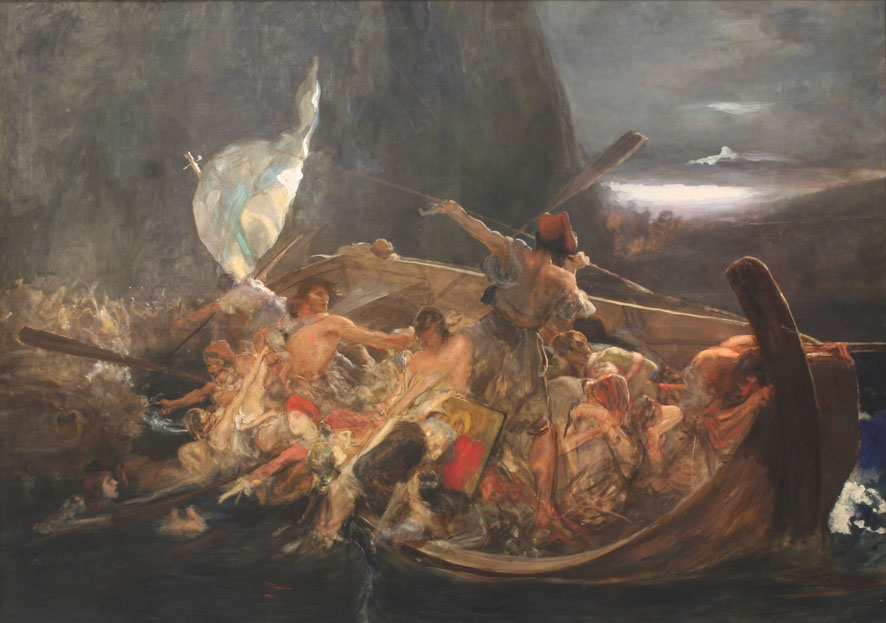 Η βάρκα τώρα είναι εκτελεσμένη με σαφήνεια σε πλήρη προοπτική απόδοση, η καρίνα -αν και είναι κατάμαυρη καμπύλη- με τα έξυπνα φώτα που έχει ριχτεί στο επάνω μέρος της έχει μεταβληθεί σε πολιορκητικό κριό που σχίζει τα ταραγμένα κύματα μέσα στην άγρια και εφιαλτική νύχτα. Παράλληλα, οι κουπαστές και από τις δυο πλευρές φωτίζονται με ανοιχτόχρωμες ώχρες, σαν να θέλει να οριοθετήσει τον χώρο της. Οι μορφές και τα αντικείμενα που ζωγραφίζονται κατανέμονται οργανικά και συνθετικά μέσα στη βάρκα, μερικά στοιχεία που βάραιναν τη σύνθεση παραλείπονται. Αντιθέτως, σημεία που τόνιζαν την τραγικότητα τώρα γίνονται περισσότερο εκφραστικά και δυνατά.