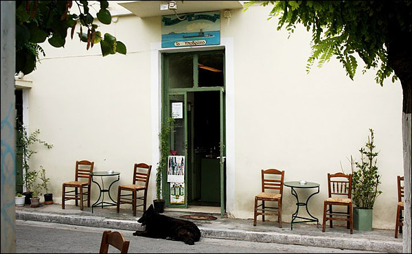 Υποβρύχιο - ΓκάζιΨάθινες καρέκλες καφενείου, τάβλι και διακοσμητικά που μοιάζουν βγαλμένα από λαογραφικό μουσείο, παραδοσιακό μωσαϊκό και φιλόξενη και εγκάρδια υποδοχή σε ένα καφενείο αυλή που προσφέρεται για Κυριακάτικα καλοκαιρινά μεσημέρια.