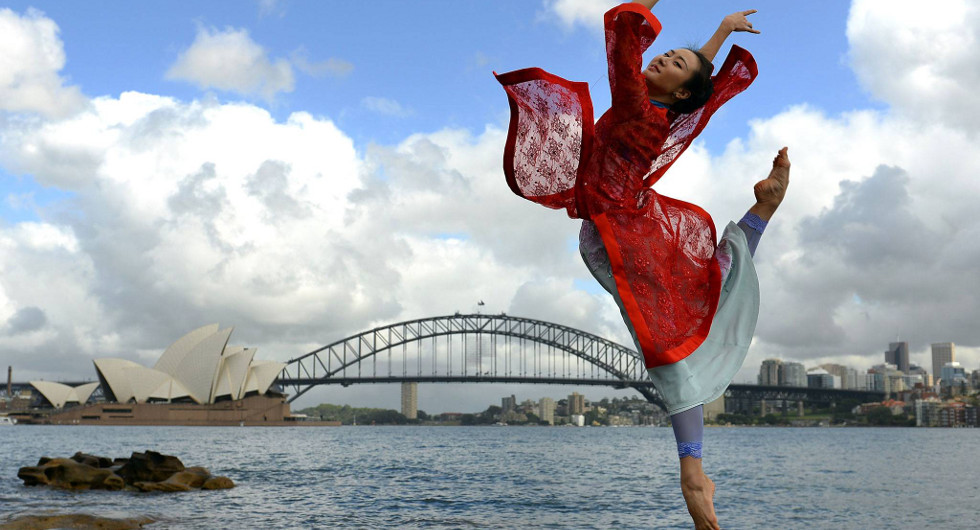 Η μπαλαρίνα Zhang Yashu μοιάζει να αιωρείται χάρη στην υπέροχα εκτελεσμένη φιγούρα που πραγματοποιεί μπροστά από την Όπερα του Σίδνεϊ, ένα από τα σημαντικότερα τουριστικά αξιοθέατα της Αυστραλίας. Η αέρινη χορεύτρια ποζάρει μπροστά από το φακό στο πλαίσιο προώθησης της εμφάνισής της με το μπαλέτο Κίνας στη μακρινή αυτή Ηπειρο.