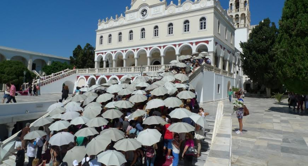 Εκατοντάδες προσκυνητές κρατώντας ομπρέλες στα χέρια κατέκλυσαν την Κυριακή τα σκαλιά του Πανίερου Ναού της Ευαγγελιστρίας στην Τήνο για την εορτή υψώσεως του Τιμίου Σταυρού.