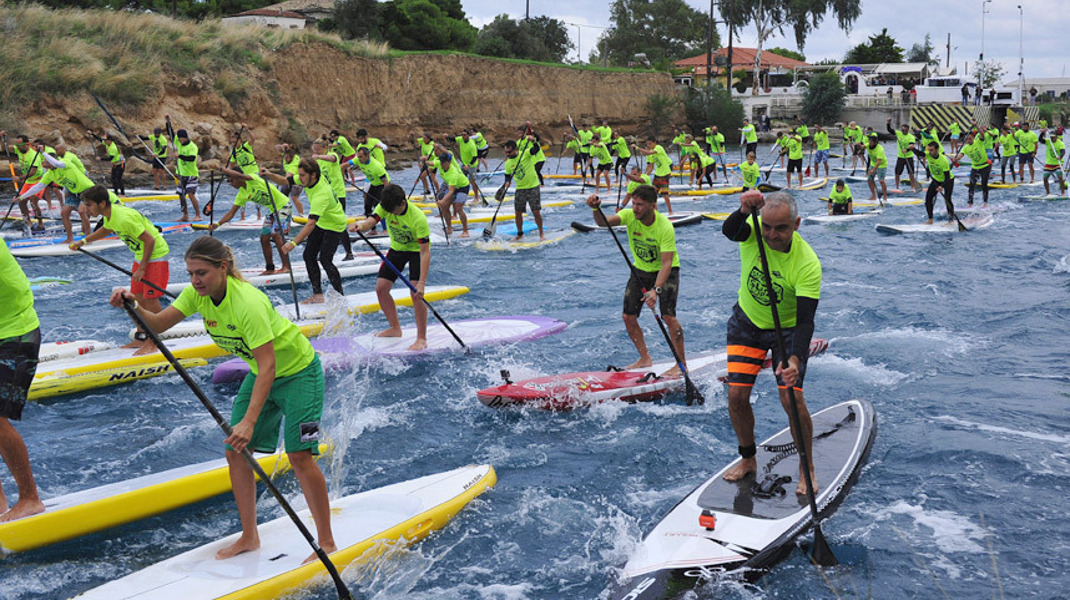 Περισσότερα από 160 άτομα συμμετείχαν στο 5ο Stand Up Paddleboarding στη Διώρυγα της Κορίνθου. Φωτογραφία: EPA/VASILIS PSOMAS