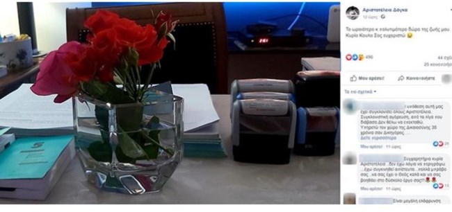 Η Εισαγγεας ανάρτησε στην προσωπική της σελίδα στο Facebook τη φωτογραφία με τα κόκκινα τριαντάφυλλα, τα οποία τοποθέτησε σε βάζο πάνω στο γραφείο της. “Το ωραιότερο και πολυτιμότερο δώρο της ζωής μου. Κυρία Κούλα… Σας ευχαριστώ”, έγραψε η εισαγγελέας  Δόγκα.