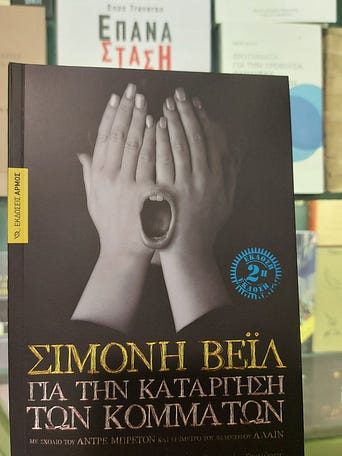Όποιος έχει διάθεση να δραπετεύσει λίγο από το αρρωστημένο μάτριξ και να σκεφθεί με διαφορετικούς, πιο υγιείς, όρους, αξίζει να διαβάσει το δοκίμιο της Σιμόνης Βέιλ με τίτλο «Για την κατάργηση των κομμάτων»⁷.