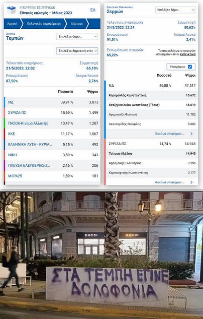Έτσι, η συμπαγής πλειοψηφία των Ελλήνων εμφανίσθηκε να αποφαίνεται ότι μια κυβέρνηση που πληρούσε σχεδόν όλα τα χαρακτηριστικά ενός δικτατορικού-αυταρχικού καθεστώτος άξιζε να επανεκλεγεί με χαρακτηριστική άνεση, αφού αρίστευσε στην διαχείριση των διαδοχικών κρίσεων (άλλως: της πολυκρίσης)¹ που της έλαχαν, δηλαδή την πανδημία, την πύρινη λαίλαπα, τα ανθρωπόμορφα ακραία καιρικά φαινόμενα, την ενεργειακή κρίση, τον ρωσο-ουκρανικό πόλεμο, την ακρίβεια, αλλά και τα Τέμπη.