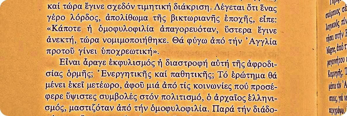 «Η διαστροφή αυτή ασφαλώς δεν έπαψε να υπάρχει ανά τους αιώνες αλλά ο χριστιανισμός που μετέβαλε την γενετήσιο ορμή σε αμάρτημα –αν δεν έχει σκοπό την τεκνοποίηση– θα είχε ως αποτέλεσμα την κρυφή ικανοποίηση της διαστροφής αυτής, άρα και την μείωσή της. Στην μακραίωνη ιστορία της Βυζαντινής Αυτοκρατορίας (απ’ όπου δεν λείπουν η ανηθικότης, η έκλυση ηθών, η πορνεία, ο δόλος και η ωμή δολοφονία) δεν φαίνεται να υπήρχε, σε έκταση αντιληπτή, η ομοφυλοφιλία».