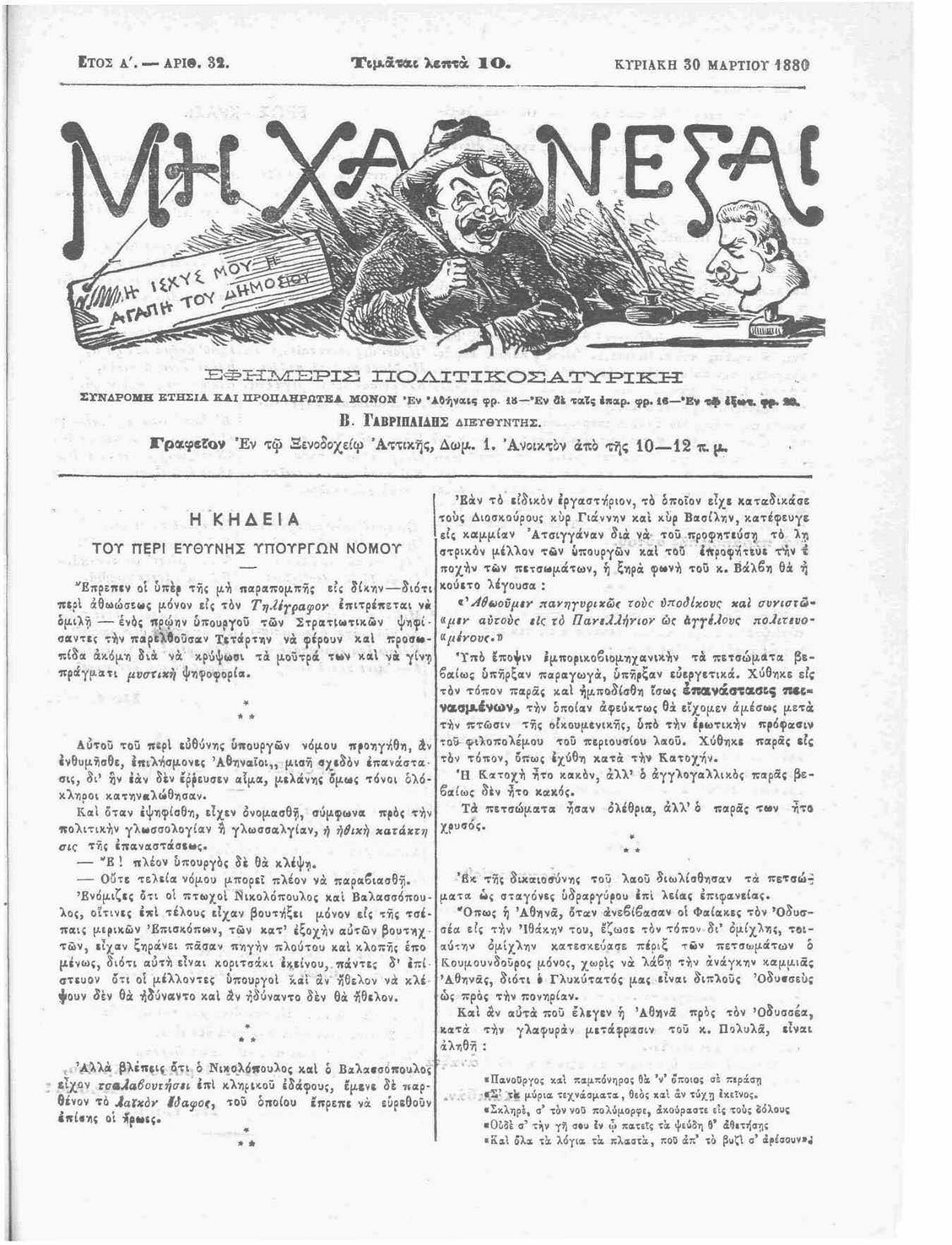 Στο περιοδικό «Μη χάνεσαι» που είχε κυκλοφορήσει στις 30 Μαρτίου 1880 (σελ. 1), ο Βλάσης Γαβριηλίδης είχε δημοσιεύσει άρθρο με τίτλο «Η κηδεία του περί ευθύνης υπουργών νόμου».