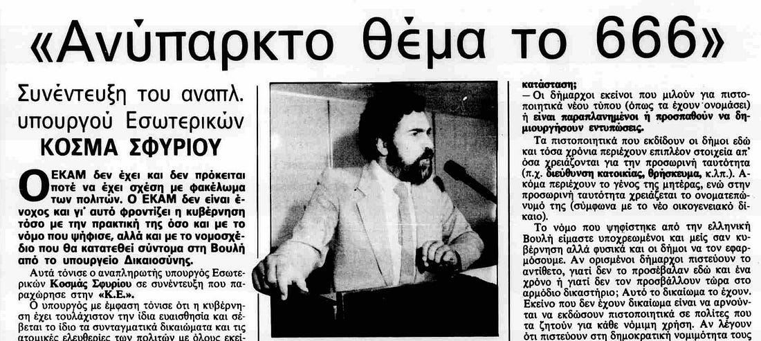 Ωστόσο, το 1997 ο Υπουργός Εσωτερικών Δημόσιας Διοίκησης και Αποκέντρωσης Λάμπρος Παπαδήμας, ο οποίος είχε διατελέσει δήμαρχος Λαμίας (1982, 1986, 1990), αντιπρόεδρος της Ένωσης Δήμων και Περιφερειών Ευρώπης (C.C.R.E., 1988-1990), Πρόεδρος της Κοινοπραξίας Ελληνικών Δήμων για την Ευρώπη (1990-1993), βουλευτής Φθιώτιδας του ΠΑΣΟΚ (1996 / 2000 / 2004), Υφυπουργός Εσωτερικών, Δημοσίας Διοίκησης και Αποκέντρωσης (1996-1998) και Υπουργός Υγείας και Πρόνοιας (1998), ερωτηθείς στην εκπομπή του δημοσιογράφου Γ. Πρετεντέρη «Η ώρα της αλήθειας» (και ενώ σε τηλεοπτικό παράθυρο ήταν παρών και ο Μητροπολίτης Αλεκανδρουπόλεως Άνθιμος) σχετικά με τους φόβους των πολιτών που τροφοδοτεί η ενδεχόμενη διασύνδεση των ταυτοτήτων με τον αντίχριστο αριθμό, είχε δώσει την ακόλουθη απάντηση: