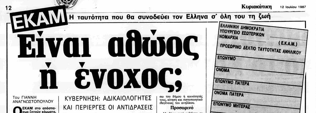 Διαβάζοντας ο σημερινός αναγνώστης ένα άρθρο του δημοσιογράφου Γιάννη Αναγνωστόπουλου, το οποίο είχε δημοσιευθεί στην εφημερίδα «Κυριακάτικη Ελευθεροτυπία» της 12ης Ιουλίου 1987 με υπέρτιτλο «ΕΚΑΜ. Η ταυτότητα που θα συνοδεύει τον Έλληνα σ’ όλη του τη ζωή», τίτλο «Είναι αθώος ή ένοχος;» και υπότιτλο «Αδικαιολόγητες και περίεργες οι αντιδράσεις», αισθάνεται σαν να έχει απώλεια της αίσθησης του χρόνου.