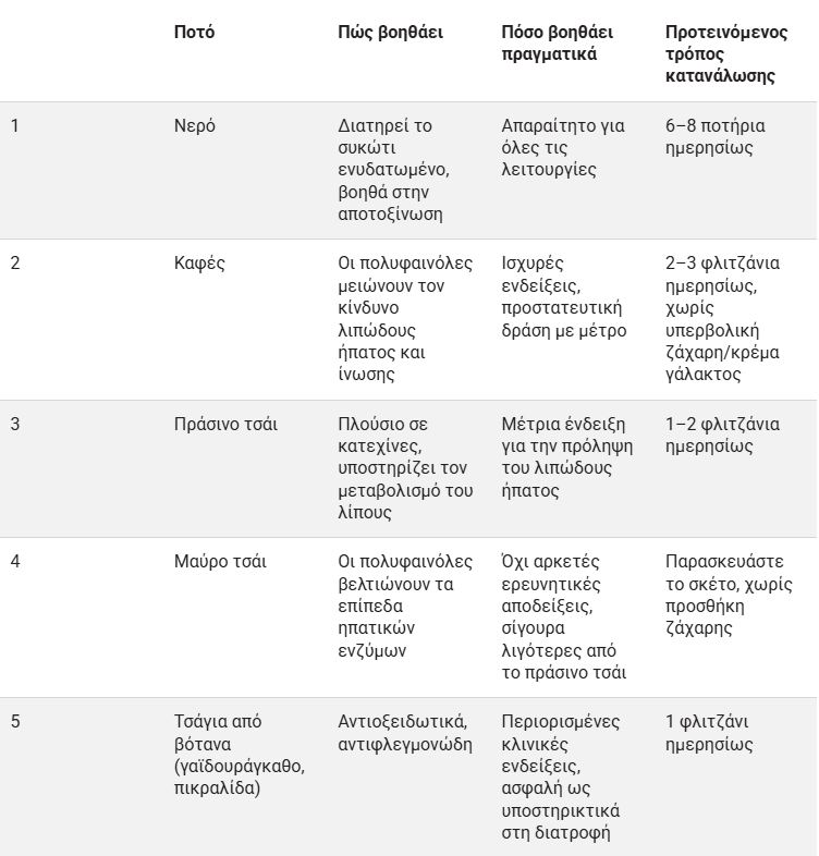 Ορισμένα ποτά περιέχουν αντιοξειδωτικά, αντιφλεγμονώδεις ενώσεις ή ενυδατικές ιδιότητες που υποστηρίζουν την ηπατική λειτουργία και μειώνουν την σχετική καταπόνηση.