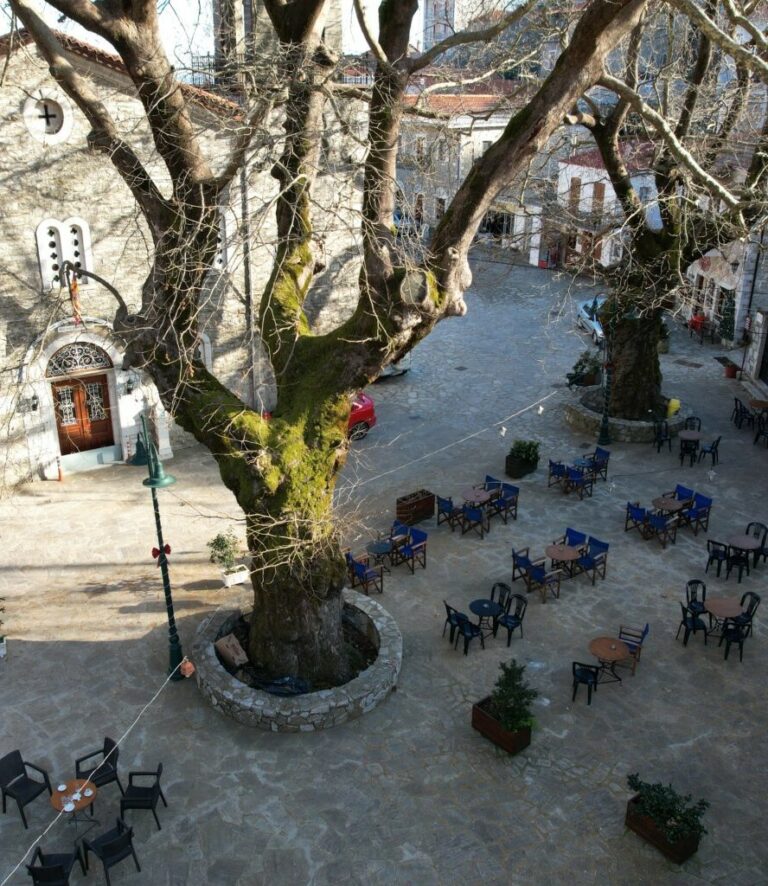 Στο κέντρο του χωριού βρίσκεται, φυσικά, η πλατεία με τα τεράστια πλατάνια και την επιβλητική εκκλησία των Αγίων Αναργύρων, στο πίσω μέρος της οποίας είναι ενσωματωμένες τρεις βρύσες με μαρμάρινες λεοντοκεφαλές. Εδώ θα περάσετε το μεγαλύτερο μέρος του χρόνου σας πίνοντας τσιπουράκια στα καφενεία, ακούγοντας τους παππούδες να θυμούνται τα παλιά και αγναντεύοντας την εξαιρετική θέα. Μια κοντινή αυτοκινητάδα ή μια όμορφη πεζοπορία, με επίσης υπέροχη θέα, είναι εκείνη προς το ξωκλήσι του Προφήτη Ηλία, πάνω από το χωριό. Αν, πάλι, πάρετε τον δρόμο προς το Πλατανάκι και τον Άγιο Βασίλειο, οδηγώντας για λίγο σε χωματόδρομο, θα φτάσετε στη θέση Ποτίστρες, όπου βρίσκεται η πέτρινη βρύση του 1929, μέσα σε μια περιοχή με τρεχούμενα νερά και πλατάνια που σκεπάζουν τα πάντα.